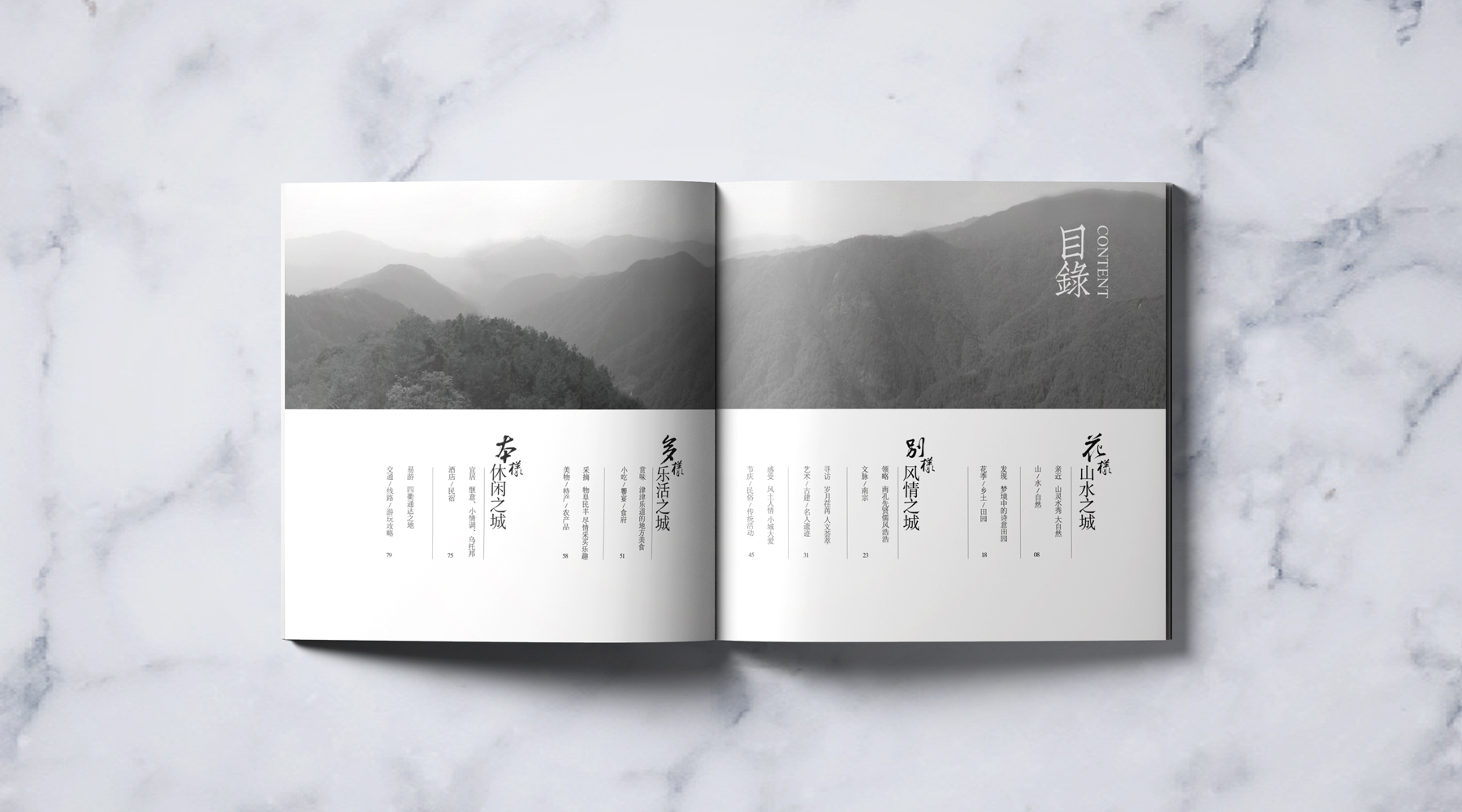 结合“广州有礼”的城市品牌形象,我们结合广州的亮点、特色。用新中式、简约现代的设计手法,以四个篇章的结构分别介绍广州的“山水、人文、美食、住行”。